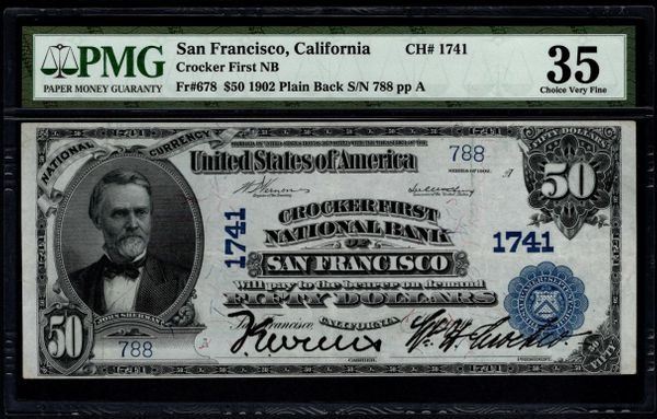 One 1902 $50 San Francisco National Bank Note PMG 35.