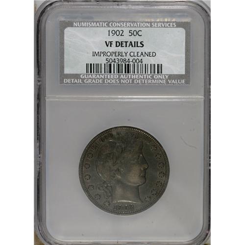<B>1902 50C --Improperly Cleaned--NCS. VF Details.</B></I> NGC Census: (1/159). PCGS Population (1/195). Mintage: 4,922,777. Numismedia Wsl. Price: $66. (#6492)<BR><BR><b>Shipping:</b> Coins & Currency (<a target="_blank" href="http://www.heritageauctions.com/common/shipping.php">view shipping information</a>)