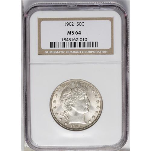 <B>1902<50C> MS64 NGC.</B></I> Well struck except for obverse star 11 and the lower right (facing) quadrant of the eagle. The highly lustrous surfaces reveal silver-gray color that yields to golden-tan peripheral patina. Well preserved and distraction-free on both sides.