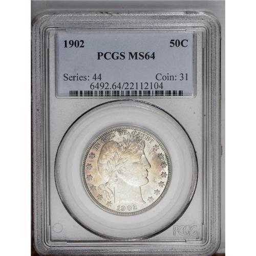 <B>1902 50C MS64 PCGS.</B></I> Blushes of reddish-gold and sky-blue toning adhere to highly lustrous surfaces on the obverse, leaving the reverse nearly untoned. The design features are well impressed, except for weakness in the upper right (facing) corner of the shield and the adjacent feathers. A few minute obverse handling marks limit the grade. Population: 40 in 64, 12 finer (12/05).