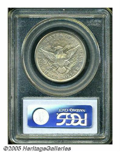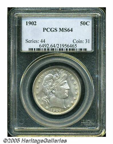 <B>1902<50C> MS64 PCGS.</B></I> Fully struck and lightly toned, with khaki-gray color on the reverse, silver-gray toning on the obverse, excellent luster, and two or three tiny marks on Liberty's neck and jaw area. Very near to Gem quality. Population: 33 in 64, 11 finer (4/05).