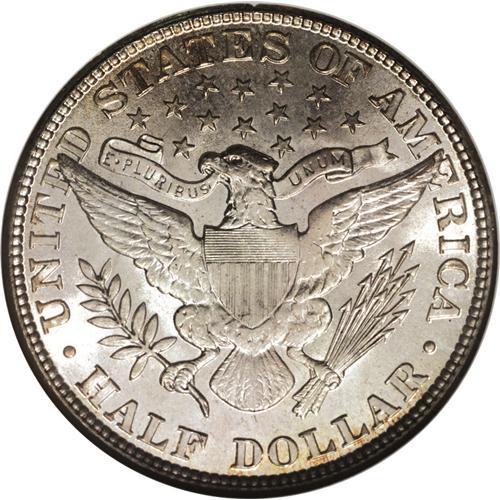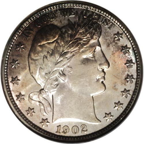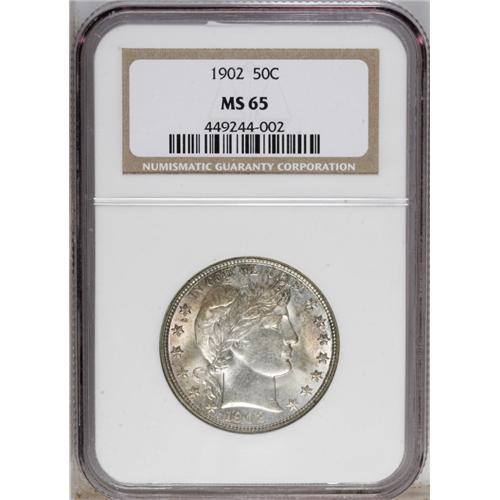 <B>1902<50C> MS65 NGC.</B></I> Surprisingly scarce for an issue with a mintage of 4.92 million pieces. Only 18 Gems have been certified by both of the major services (11 by PCGS, seven by NGC) and only nine coins are finer (7/06). This is a remarkably lustrous coin that shows strong striking details on the obverse and slight weakness on the reverse. Mostly brilliant, the obverse displays scattered golden-brown and lilac toning around the margin. The reverse is also mostly brilliant.
