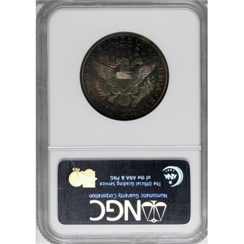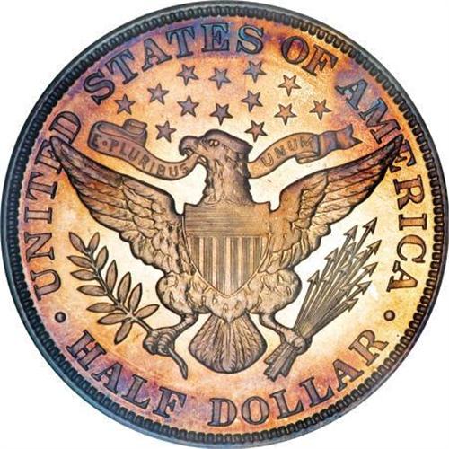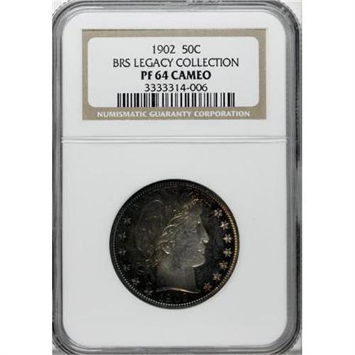 <B>1902 50C PR64 Cameo NGC.</B></I> Ex: BRS Legacy Collection. This splendidly toned specimen has generous blushes of rose-red and ocean-blue patina. The central reverse and right obverse are brilliant. The fletchings are well struck, although some softness is noted near the right shield corner and on the laurel leaves above the ear. A scant 777 proofs were issued.<BR><BR><b>Shipping:</b> Coins & Currency (<a target="_blank" href="http://www.heritageauctions.com/common/shipping.php">view shipping information</a>)