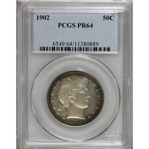 <B>1902 50C PR64 PCGS.</B></I> This near-Gem possesses potent reflectivity in spite of hazy dove-gray patina that covers the fields. Modestly hairlined with deeper violet-tinged toning at the periphery.<BR><BR><b>Shipping:</b> Coins & Currency (<a target="_blank" href="http://www.heritageauctions.com/common/shipping.php">view shipping information</a>)