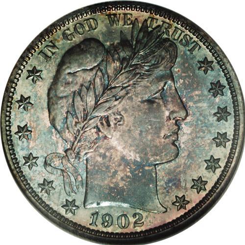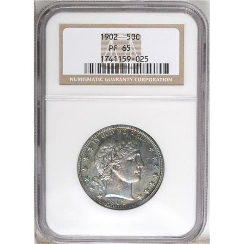 <B>1902 50C PR65 NGC.</B></I> Mottled aqua-blue and salmon-pink toning embrace this splendidly smooth Gem. The strike is exquisite on the fletchings, often found soft for this type, while the area of the right shield corner shows only moderate incompleteness. A scant 777 pieces were struck. Census: 30 in 65, 38 finer (10/06).<BR><I>From The James Paul Collection.</B></I><BR><BR><b>Shipping:</b> Coin/Currency (<a target="_blank" href="http://www.heritageauctions.com/common/shipping.php">view shipping information</a>)