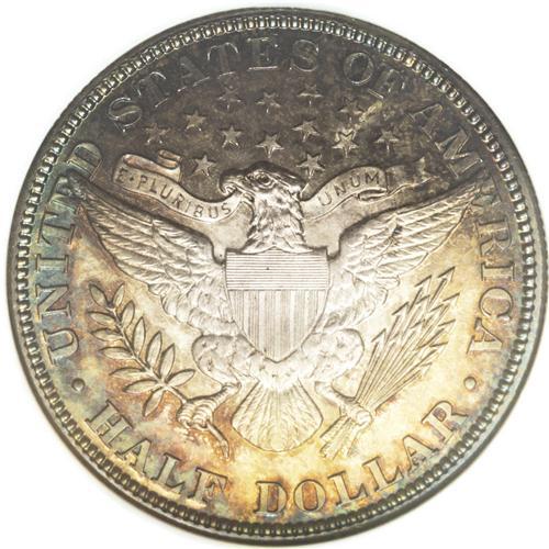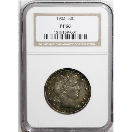 <B>1902<50C> PR66 NGC.</B></I> A moderately toned Gem proof with mostly golden-brown and iridescent toning on each side, lighter at the centers. Unlike most examples of this date, this piece actually displays light cameo contrast beneath the toning. It has a sharp strike and excellent eye appeal.