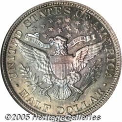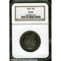 <B>1902 50C PR66 NGC.</B></I> Mauve and cobalt-blue patina overlays lovingly preserved surfaces. A stingy mintage of 777 pieces confirms the rarity of this proof date in high grades. Population: 21 in 66, 13 finer (2/05).