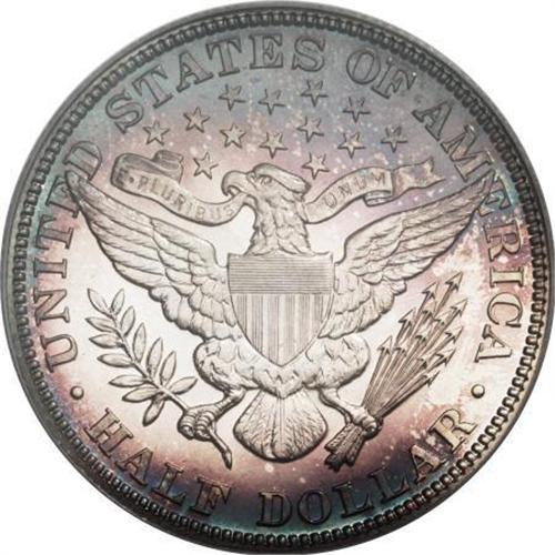 <B>1902 50C PR66 PCGS.</B></I> A mix of cobalt-blue and lavender cover the obverse of this proof half, while the same palette is confined to the borders of the reverse, leaving most of the central areas brilliant. A relatively strong impression is seen on the design elements, except for the usual softness in the upper right corner of the shield. Population: 23 in 66, 5 finer (1/08).<BR><BR><B>Coin Engraver:</B> Charles E. Barber<BR><BR><b>Shipping:</b> Coins & Currency (<a target="_blank" href="http://www.heritageauctions.com/common/shipping.php">view shipping information</a>)