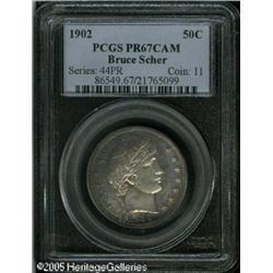 <B>1902 50C PR67 Cameo PCGS.</B></I> The brilliant centers are framed with wide bands of rich fire-red, mauve, and apple-green color. A well struck and essentially pristine Superb Gem. A mere 777 pieces were struck. As of (1/05), the present Superb Gem is the single finest PCGS certified proof 1902 Half Dollar. No Deep Cameo pieces have been encapsulated in any grade by PCGS, and without a Cameo designation, none have been certified above PR67. Population: 1 in 67 Cameo, none finer (1/05).<BR><I>From the Bruce Scher #1 All-Time PCGS Registry Set.</B></I> Lot:4118