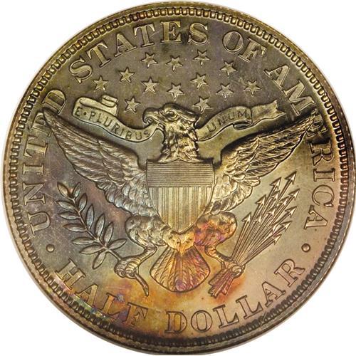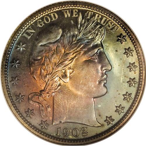 <B>1902 50C PR68 NGC.</B></I> Dramatic orange-gold, ocean-blue, and lime-green toning dominates this beautiful high grade proof Barber half. The flashy fields are as smooth as glass, and the strike is intricate aside from the usual slight merging of detail near the upper right shield corner. A prize for the connoisseur of splendidly patinated silver coinage. A scant 777 proofs were struck, which was the lowest production since 1898. Our auction records reveal only one other appearance of a PR68 1902 half, a Cameo specimen that realized $32,200 as lot 4282 in our 2005 FUN Signature. Census: 2 in 68, 0 finer (2/07).<BR><BR><b>Shipping:</b> Coins & Currency (<a target="_blank" href="http://www.heritageauctions.com/common/shipping.php">view shipping information</a>)