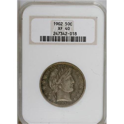 <B>1902 50C XF40 NGC.</B></I> NGC Census: (4/157). PCGS Population (7/188). Mintage: 4,922,777. Numismedia Wsl. Price for NGC/PCGS coin in XF40: $125. (#6492)<BR><BR><B>Coin Engraver:</B> Charles E. Barber<BR><BR><b>Shipping:</b> Coins & Currency (<a target="_blank" href="http://www.heritageauctions.com/common/shipping.php">view shipping information</a>)