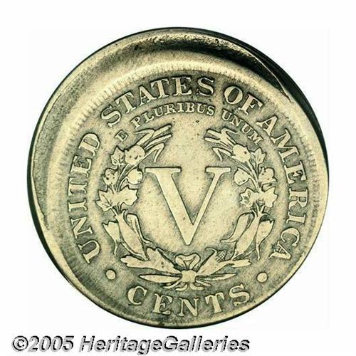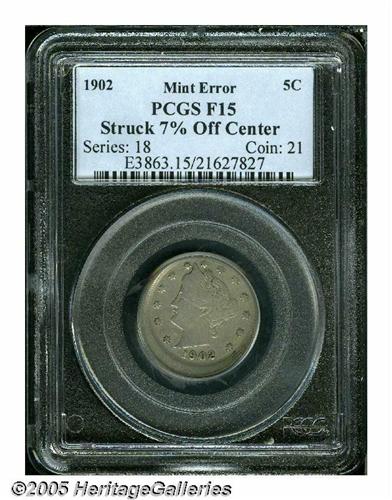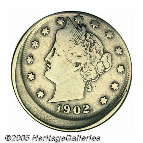 <B>1902<5C> Liberty Nickel--Struck 7% Off Center--Fine 15 PCGS.</B></I> A textbook Fine with the design elements tilted toward 1 o'clock. The shift is modest enough that all devices are clear.<BR><I>From The Larry Rausch Collection, Part Five.</B></I>