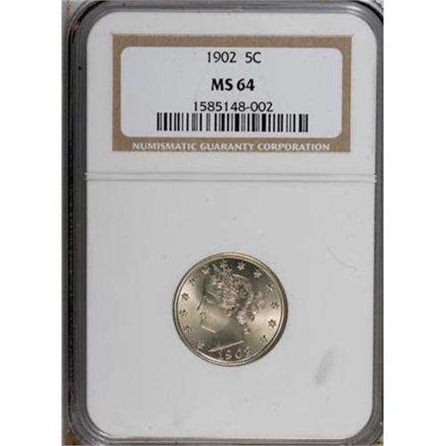 <B>1902 5C MS64 NGC.</B></I> NGC Census: (210/179). PCGS Population (267/193). Mintage: 31,489,580. Numismedia Wsl. Price for NGC/PCGS coin in MS64: $192. (#3863)<BR><BR><B>Coin Engraver:</B> Charles E. Barber<BR><BR><b>Shipping:</b> Coins & Currency (<a target="_blank" href="http://www.heritageauctions.com/common/shipping.php">view shipping information</a>)