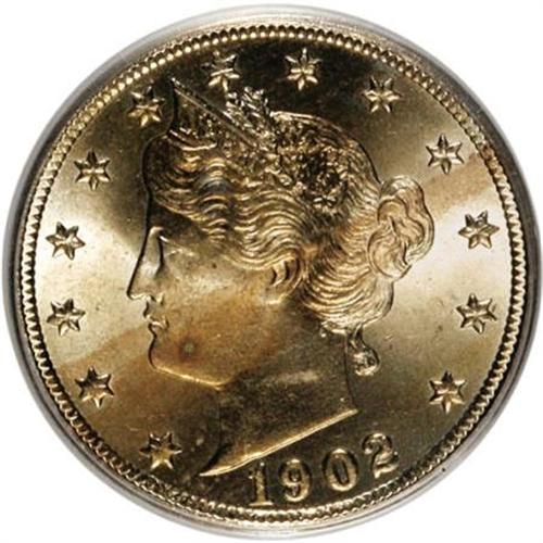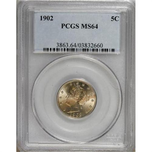 <B>1902 5C MS64 PCGS.</B></I> PCGS Population (260/215). NGC Census: (206/180). Mintage: 31,489,580. Numismedia Wsl. Price for NGC/PCGS coin in MS64: $188. (#3863)<BR><BR><b>Shipping:</b> Coins & Currency (<a target="_blank" href="http://www.heritageauctions.com/common/shipping.php">view shipping information</a>)