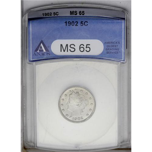 1902 5C MS65 ANACS. Highly lustrous light gray surface 1902[5C] MS65 ANACS.