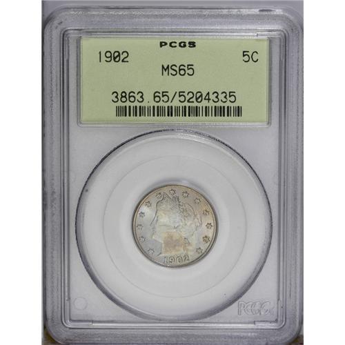 1902 5C MS65 PCGS. A pleasing array of bluish-green, d