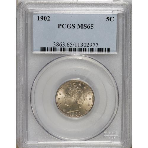 <B>1902 5C MS65 PCGS.</B></I> PCGS Population (169/46). NGC Census: (145/36). Mintage: 31,489,580. Numismedia Wsl. Price: $560. (#3863)<BR><BR><b>Shipping:</b> Coins & Currency (<a target="_blank" href="http://www.heritageauctions.com/common/shipping.php">view shipping information</a>)