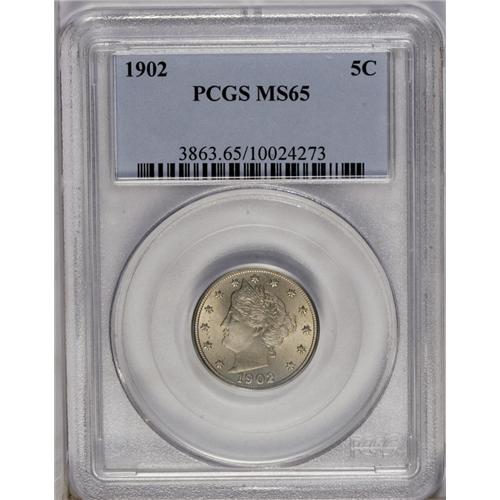 <B>1902<5C> MS65 PCGS.</B></I> Sharply struck devices complement attractive golden-gray patination that overlies lustrous surfaces. Some tiny flecks are noted in the left obverse field.