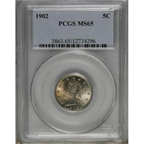<B>1902 5C MS65 PCGS.</B></I> PCGS Population (154/47). NGC Census: (145/35). Mintage: 31,489,580. Numismedia Wsl. Price for NGC/PCGS coin in MS65: $575. (#3863)<BR><BR><B>Coin Engraver:</B> Charles E. Barber<BR><BR><b>Shipping:</b> Coins & Currency (<a target="_blank" href="http://www.heritageauctions.com/common/shipping.php">view shipping information</a>)