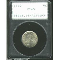 <TABLE cellSpacing=0 cellPadding=0 width="100%" bgColor=#000000 border=0><TBODY><TR><TD width="100%"><TABLE cellSpacing=1 cellPadding=3 width="100%" border=0><TBODY><TR><TD width="100%" bgColor=#79735c><FONT face=arial color=#ffffff size=3><B>Description</B> </FONT></TD></TR><TR><TD width="100%" bgColor=#ffffff><FONT face=arial size=2><B>1902 5C MS65 PCGS.</B></I> Satiny, with a slightly green patina. Some luster marks are noted, primarily in the obverse peripheries. Also noted are a number of very faint wispy abrasions. Overall a lustrous and appealing example. Population: 87 in 65, 22 finer (8/03). </FONT></TD></TR></TBODY></TABLE></TD></TR></TBODY></TABLE><BR><A name=PricesRealized></A><TABLE cellSpacing=0 cellPadding=0 width="100%" bgColor=#000000 border=0><TBODY><TR><TD width="100%"><TABLE cellSpacing=1 cellPadding=3 width="100%" border=0><TBODY><TR><TD width="100%" bgColor=#79735c><A name=PR><FONT face=arial color=#ffffff size=3><B>Previous Prices from Heritage Auctions</B> </FONT></A></TD></TR><TR><TD bgColor=#f6f6ed><TABLE cellSpacing=0 cellPadding=0 width="100%" border=1><TBODY><TR><TD align=middle width="33%"><B>Date</B></TD><TD align=middle width="33%"><B>Service</B></TD><TD align=middle width="33%"><B>Price</B></TD></TR><TR bgColor=whitesmoke><TD width="33%"><B>06/03/1994</B></TD><TD width="33%">PCGS</TD><TD width="33%">$577.50</TD></TR><TR bgColor=whitesmoke><TD width="33%"><B>08/08/1998</B></TD><TD width="33%">PCGS</TD><TD width="33%">$467.50</TD></TR><TR bgColor=whitesmoke><TD width="33%"><B>02/12/2000</B></TD><TD width="33%">PCGS</TD><TD width="33%">$425.50</TD></TR><TR bgColor=whitesmoke><TD width="33%"><B>09/28/2002</B></TD><TD width="33%">NGC</TD><TD width="33%">$349.60</TD></TR><TR bgColor=whitesmoke><TD width="33%"><B>06/06/1998</B></TD><TD width="33%">NGC</TD><TD width="33%">$327.75</TD></TR><TR bgColor=whitesmoke><TD width="33%"><B>04/24/1999</B></TD><TD width="33%">NGC</TD><TD width="33%">$330.00</TD></TR><TR bgColor=whitesmoke><TD width="33%"><B>05/13/2003</B></TD><TD width="33%">PCGS</TD><TD width="33%">$471.50</TD></TR><TR bgColor=whitesmoke><TD width="33%"><B>03/25/2003</B></TD><TD width="33%">PCGS</TD><TD width="33%">$448.50</TD></TR><TR bgColor=whitesmoke><TD width="33%"><B>06/04/1993</B></TD><TD width="33%">NGC</TD><TD width="33%">$385.00</TD></TR><TR bgColor=whitesmoke><TD width="33%"><B>11/23/2002</B></TD><TD width="33%">PCGS</TD><TD width="33%">$425.50</TD></TR><TR bgColor=whitesmoke><TD width="33%"><B>09/28/2002</B></TD><TD width="33%">PCGS</TD><TD width="33%">$488.75</TD></TR><TR bgColor=whitesmoke><TD width="33%"><B>07/09/2002</B></TD><TD width="33%">PCGS</TD><TD width="33%">$414.00</TD></TR><TR bgColor=whitesmoke><TD width="33%"><B>07/01/2003</B></TD><TD width="33%">NGC</TD><TD width="33%">$391.00</TD></TR></TBODY></TABLE></TD></TR><TR><TD bgColor=#ffffff><FONT face=arial size=1 ?>PLEASE NOTE: All prices realized reflect the final hammer price PLUS the buyer's premium in auctions that charge a buyer's premium. Each item has a notation at the top of the listing indicating whether that lot included a buyer's premium. Example: A item that sells with a final hammer price of $100 and a 20% buyer's premium will display with a price realized of $120. All information listed is intended to be as accurate as possible, but errors are possible. Please use this guide carefully and inform us of any inaccuracies. </FONT></TD></TR></TBODY></TABLE></TD></TR></TBODY></TABLE><BR><TABLE cellSpacing=0 cellPadding=0 width="100%" bgColor=#000000 border=0><TBODY><TR><TD width="100%"><TABLE cellSpacing=1 cellPadding=3 width="100%" border=0><TBODY><TR><TD width="100%" bgColor=#79735c colSpan=6><FONT face=arial color=#ffffff size=3><B>Price Guide*</B> </FONT></TD></TR><TR bgColor=#f6f6ed><TD align=middle><B>Grade</B> </TD><TD align=middle><B>Coin World<BR>(Trends)</B> </TD><TD align=middle><B>Numismedia<BR>Retail</B> </TD><TD align=middle><B>Numismedia<BR>Wholesale</B> </TD><TD align=middle><B>Coin<BR>Universe</B> </TD><TD align=middle><B>Heritage<BR>Value Index</B> </TD></TR><TR bgColor=#ffffff><TD align=middle>64</TD><TD align=right>$180.00</TD><TD align=right>$225.00</TD><TD align=right>$180.00</TD><TD align=right>$185.00</TD><TD align=right>$136.13</TD></TR><TR style="FONT-WEIGHT: bold" bgColor=#cccfdd><TD align=middle>65</TD><TD align=right>$535.00</TD><TD align=right>$480.00</TD><TD align=right>$384.00</TD><TD align=right>$750.00</TD><TD align=right>$406.63</TD></TR><TR bgColor=#ffffff><TD align=middle>66</TD><TD align=right>$1,350.00</TD><TD align=right>---</TD><TD align=right>$925.00</TD><TD align=right>$1,950.00</TD><TD align=right>$995.00</TD></TR><TR bgColor=#ffffff><TD colSpan=6><FONT size=1>*All information listed is intended to be as accurate as possible, but errors are possible. No item may be returned or refused based on this information which is provided as a service to our customers. You should contact each pricing source directly to determine the accuracy of this information. </FONT></TD></TR></TBODY></TABLE></TD></TR></TBODY></TABLE><BR><TABLE cellSpacing=0 cellPadding=0 width="100%" bgColor=#000000 border=0><TBODY><TR><TD width="100%"><TABLE cellSpacing=1 cellPadding=3 width="100%" border=0><TBODY><TR><TD width="100%" bgColor=#79735c><FONT face=arial color=#ffffff size=3><B>Population Guide</B> </FONT></TD></TR><TR bgColor=#ffffff><TD align=middle><!-- Begin Output of Population Grid--><TABLE cellSpacing=0 cellPadding=0 width="100%" border=0><TBODY><TR><TD vAlign=center><TABLE cellSpacing=0 width="100%" border=1 cellsadding="3"><TBODY><TR><TD vAlign=center><TABLE cellSpacing=0 cellPadding=3 width="100%" border=1><TBODY><TR><TD vAlign=center align=middle bgColor=#f0f1e8 colSpan=2 <CENTER><FONT face=Arial size=2><B>PCGS Pop </B></FONT><CENTER></CENTER></TD><TD vAlign=center align=middle bgColor=#f0f1e8 colSpan=2><CENTER><FONT face=Arial size=2><B>NGC Pop</B></CENTER></FONT></TD></TR><TR><TD vAlign=center><FONT face=Arial size=2>(65)</FONT> </TD><TD vAlign=ce