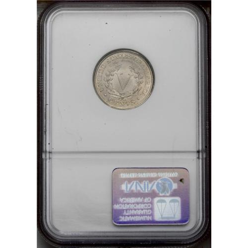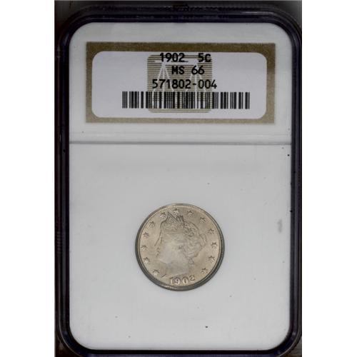 <B>1902<5C> MS66 NGC.</B></I> Golden-gray toning adheres to matte-like surfaces that emit glowing luster. Except for softness in the centers of the first two stars, the design features are well impressed. A tiny mark at the upper bridge of Liberty's nose is mentioned for accuracy. Census: 29 in 66, 4 finer (2/06).