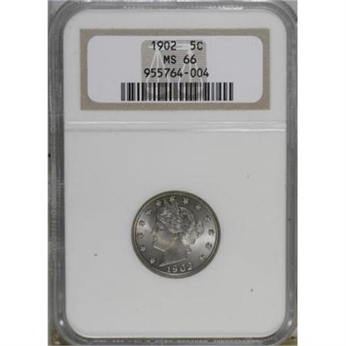 <B>1902 5C MS66 NGC.</B></I> This elegant blue-gray piece offers excellent visual appeal and uncommonly pleasing luster. Well struck overall with just a touch of softness at the peripheral elements. Census: 31 in 66, 4 finer (2/08).<BR><BR><B>Coin Engraver:</B> Charles E. Barber<BR><BR><b>Shipping:</b> Coins & Currency (<a target="_blank" href="http://www.heritageauctions.com/common/shipping.php">view shipping information</a>)