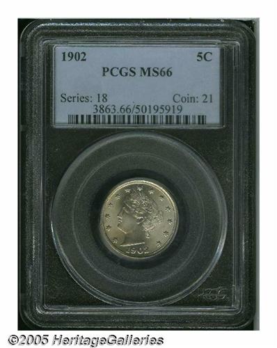 1902 5C MS66 PCGS. Bright, silvery, lustrous surf
