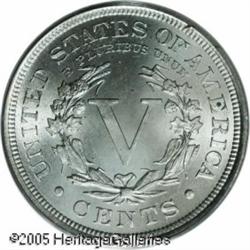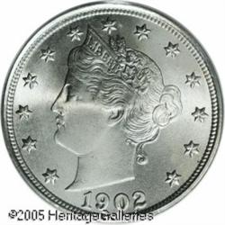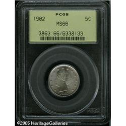 <B>1902 5C MS66 PCGS.</B></I> Satiny and impeccably smooth, with the slightest tinge of lilac patina in the recesses. A wispy die crack traverses the right side of the reverse. The strike on this rock solid Premium Gem is boldly executed in all areas. Population: 29 in 66, 3 finer (1/05). Lot:5892