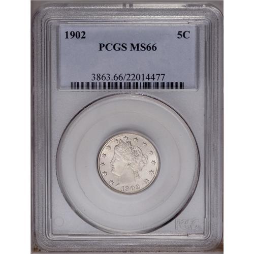 <B>1902<5C> MS66 PCGS.</B></I> Well struck with scintillating luster and untoned silver-gray surfaces that are virtually pristine. Population: 36 in 66, 3 finer (1/06).