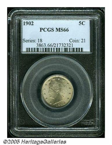 <B>1902<5C> MS66 PCGS.</B></I> Well struck with shimmering luster and matte-like surfaces that display a pair of small reddish-apricot streaks on the obverse. Very scarce at or above this grade level. Population: 34 in 66, 3 finer (3/05).