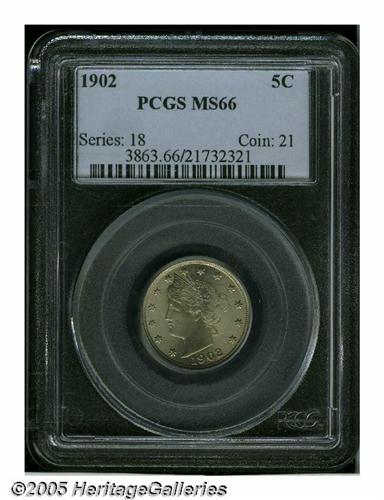 <B>1902<5C> MS66 PCGS.</B></I> Well struck with shimmering luster and matte-like surfaces that display a pair of small reddish-apricot streaks on the obverse. Very scarce at or above this grade level. Population: 33 in 66, 3 finer (6/05).