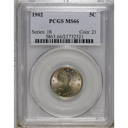 1902 5C MS66 PCGS. Well struck with shimmering, satiny