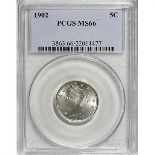 <B>1902 5C MS66 PCGS.</B></I> Well struck with scintillating luster and untoned, virtually pristine nickel-gray surfaces. This mid-date issue is highly elusive any finer, with only three such pieces certified by PCGS (1/08).<BR><BR><B>Coin Engraver:</B> Charles E. Barber<BR><BR><b>Shipping:</b> Coins & Currency (<a target="_blank" href="http://www.heritageauctions.com/common/shipping.php">view shipping information</a>)