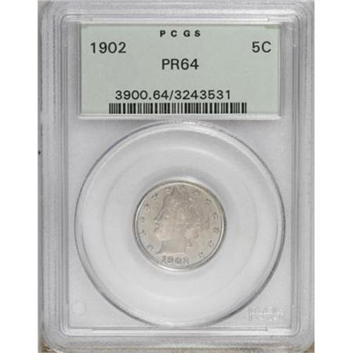 <B>1902 5C PR64 PCGS.</B></I> PCGS Population (168/186). NGC Census: (127/219). Mintage: 2,018. Numismedia Wsl. Price for NGC/PCGS coin in PR64: $284. (#3900)<BR><BR><B>Coin Engraver:</B> Charles E. Barber<BR><BR><b>Shipping:</b> Coins & Currency (<a target="_blank" href="http://www.heritageauctions.com/common/shipping.php">view shipping information</a>)