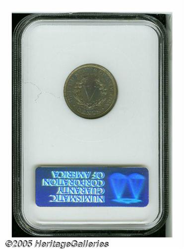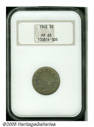 <B>1902<5C> PR65 NGC.</B></I> Bright surfaces are overrun with light milky gray-gold patina imbued with faint hints of ice-blue, and are virtually devoid of significant contact marks. All of the design elements are well brought up. Population: 119 in 65, 83 finer (6/05).