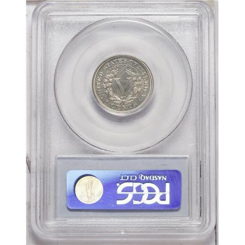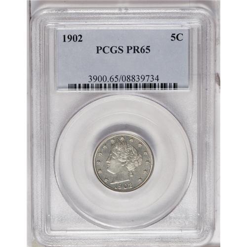 <B>1902<5C> PR65 PCGS.</B></I> The well struck surfaces are light silver-gold. A couple of tiny dark spots, mostly in the obverse field, likely preclude a higher grade. Midgrade proof Liberty nickels seem to be quite underrated in today's active numismatic marketplace.