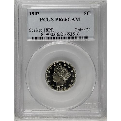 <B>1902<5C> PR66 Cameo PCGS.</B></I> Brilliant and exquisitely struck with devices that show a mild encrustation of frosting. An exceptionally appealing Premium Gem that is rarely encountered with the Cameo designation. Population: 4 in 66, 5 finer (5/06).