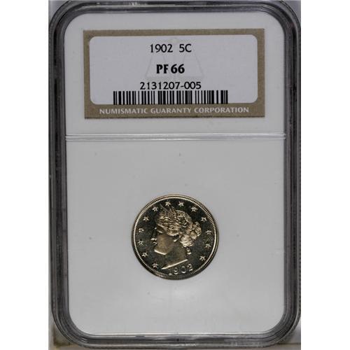<B>1902<5C> PR66 NGC.</B></I> Reflective and deeply mirrored for the issue, with light golden patina that has settled over both sides. The sharp strike has captured nearly every detail in the coronet and wreath.<BR><I>From The Mulholland Collection.</B></I>