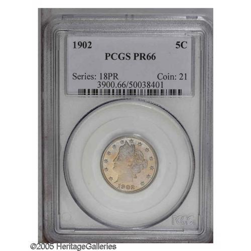 1902 5C PR66 PCGS. Luminous proof surfaces are overlay 1902[5C] PR66 PCGS.