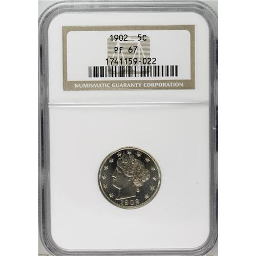 <B>1902 5C PR67 NGC.</B></I> Moderately reflective beneath pale orange and green patina. This crisply struck piece is one of just 2,018 proofs coined. Census: 11 in 67, 0 finer (10/06).<BR><I>From The James Paul Collection.</B></I><BR><BR><b>Shipping:</b> Coin/Currency (<a target="_blank" href="http://www.heritageauctions.com/common/shipping.php">view shipping information</a>)