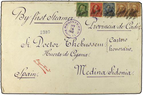 1902 ADMON. AMERICANA. Sobre CERTIFICADO de MANILA a CADIZ. 1c. verde, 2c rojo, 5c azul y 10c castaño. Fechador MANILA/REGISTERED. (Yvert 176,177,180,183(2)), (Sc.213/4, 216,217(2)).
