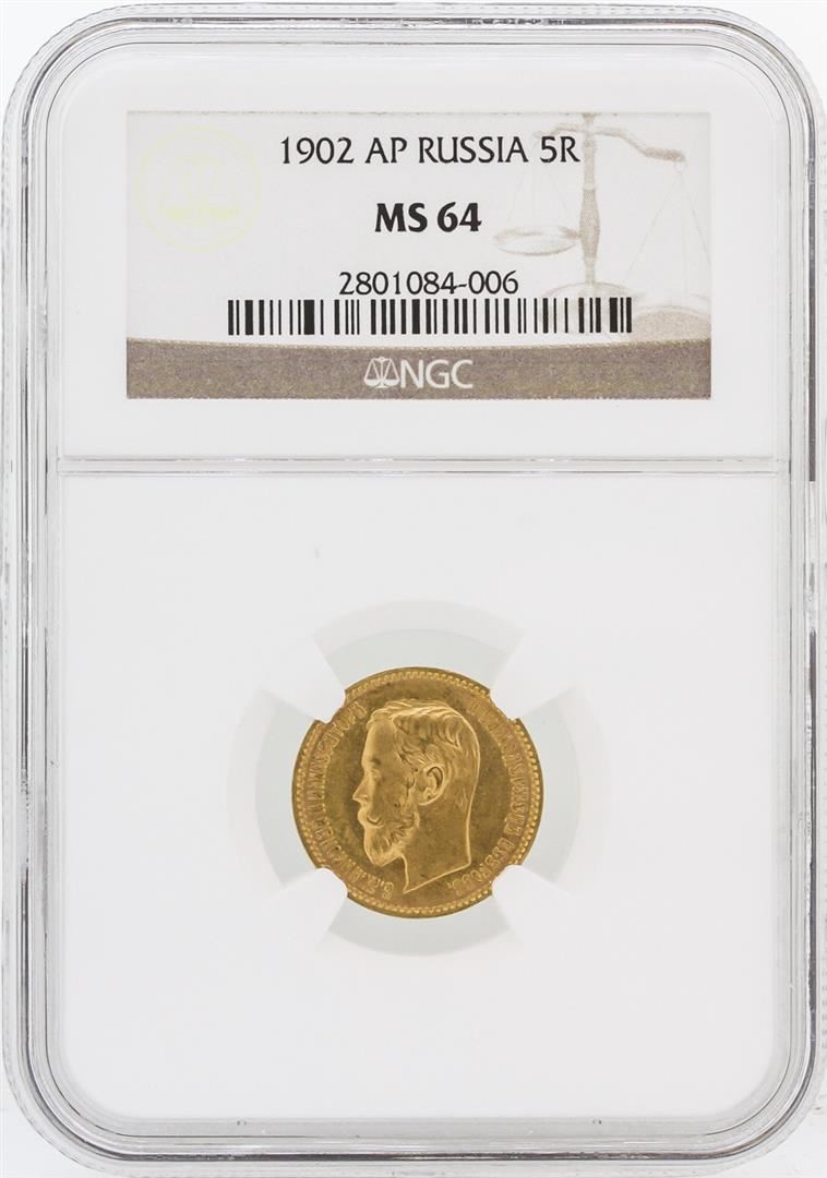 One 1902-AP NGC MS64 Russia 5R Gold Coin. NGC Certified.