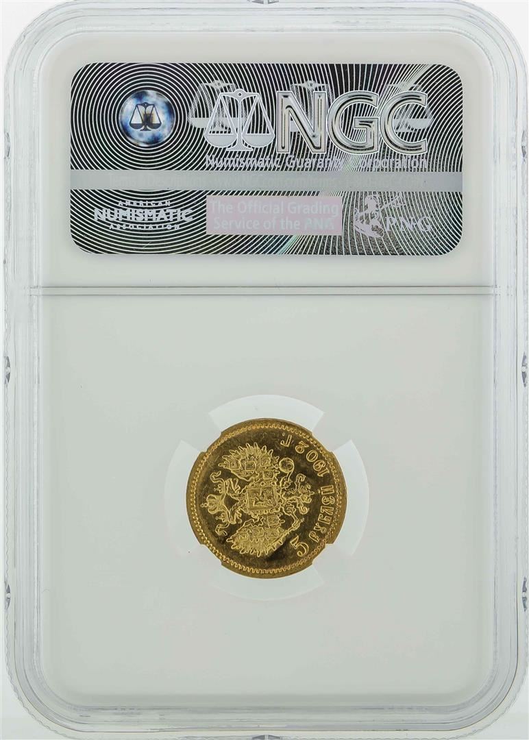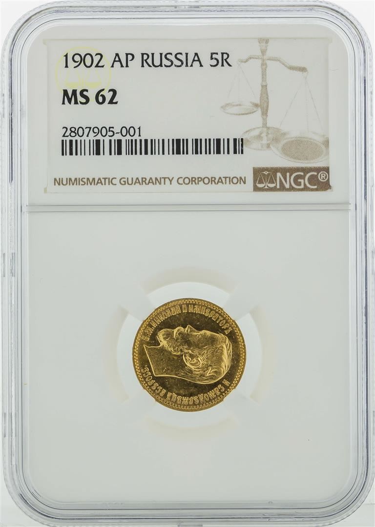 One 1902-AP Russia 5 Roubles Gold Coin NGC MS62. NGC Certified.