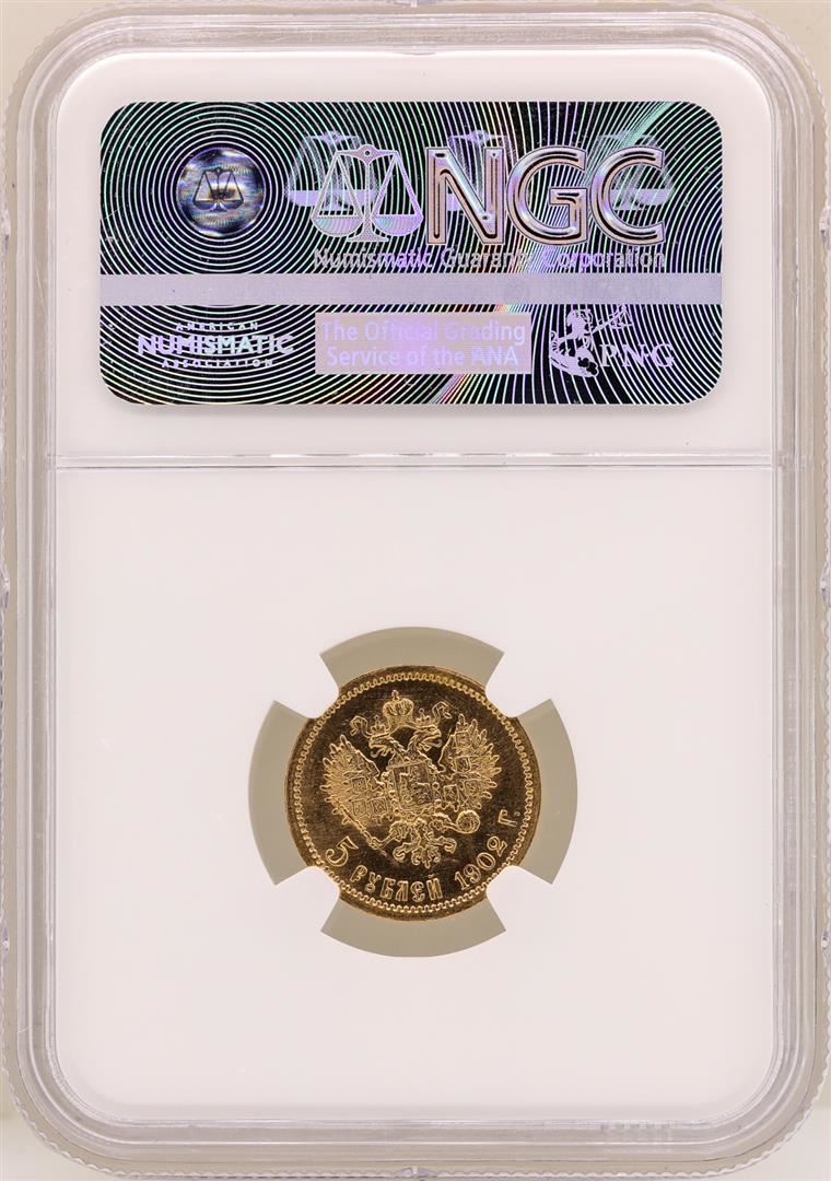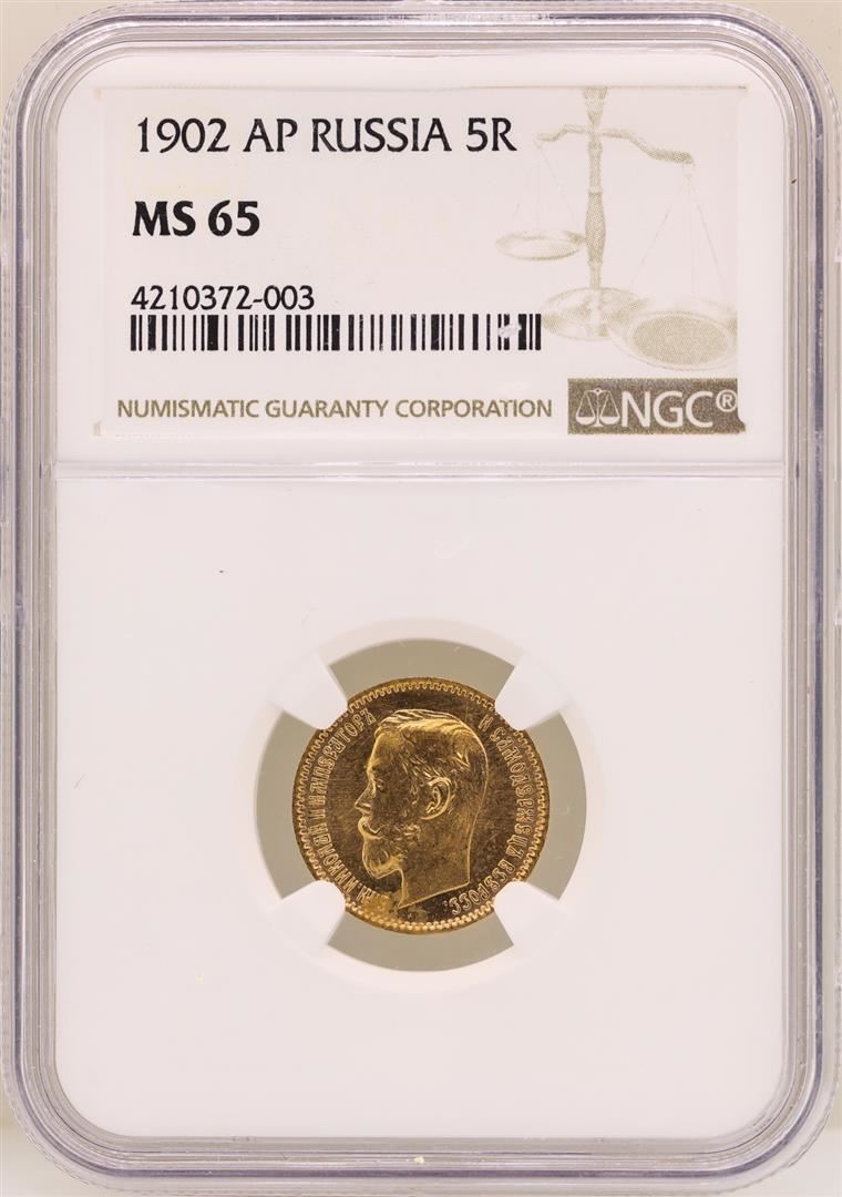 One 1902-AP Russia 5 Roubles Gold Coin NGC MS65. NGC Certified.