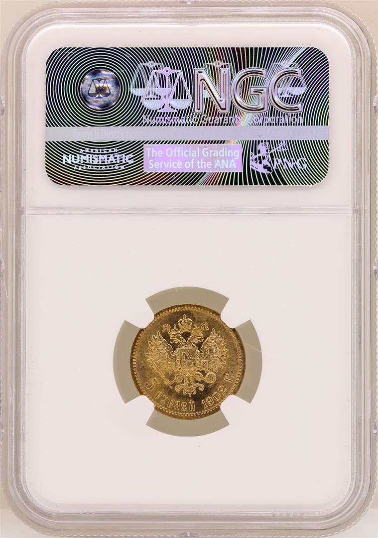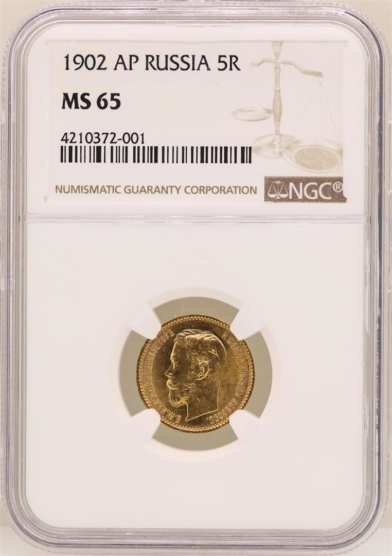 One 1902-AP Russia 5 Roubles Gold Coin NGC MS65. NGC Certified.