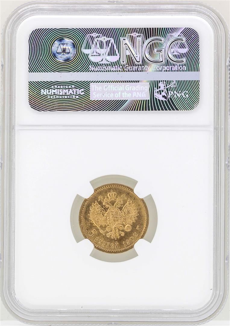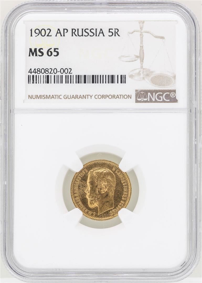 One 1902 AP Russia 5 Rubles Gold Coin NGC MS65. NGC Certified.