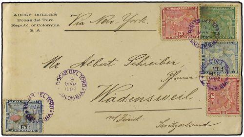 1902 BOLAS DEL TORO a SUIZA. 1 ctvo. verde, 2 ctvos. rosa (2) y 5 ctvos. azul (2), mat. fechador BOL