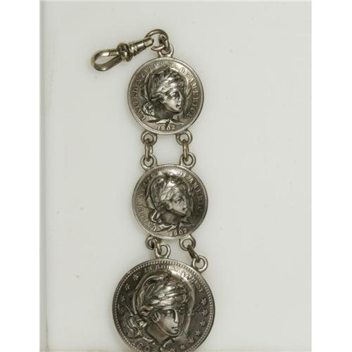 <B>1902 Barber Coin Three-Piece Watch Fob Pop-Out Heads.</B></I> This lot is similar to the preceding lot, except the date on the coins is 1902 and the coins include two dimes and one quarter (has a pin attached to the reverse). In addition, the date bar has the patent date of Feb 03. The current market value is approximately $125-$175.<BR><BR><b>Shipping:</b> Coins & Currency (<a target="_blank" href="http://www.heritageauctions.com/common/shipping.php">view shipping information</a>)