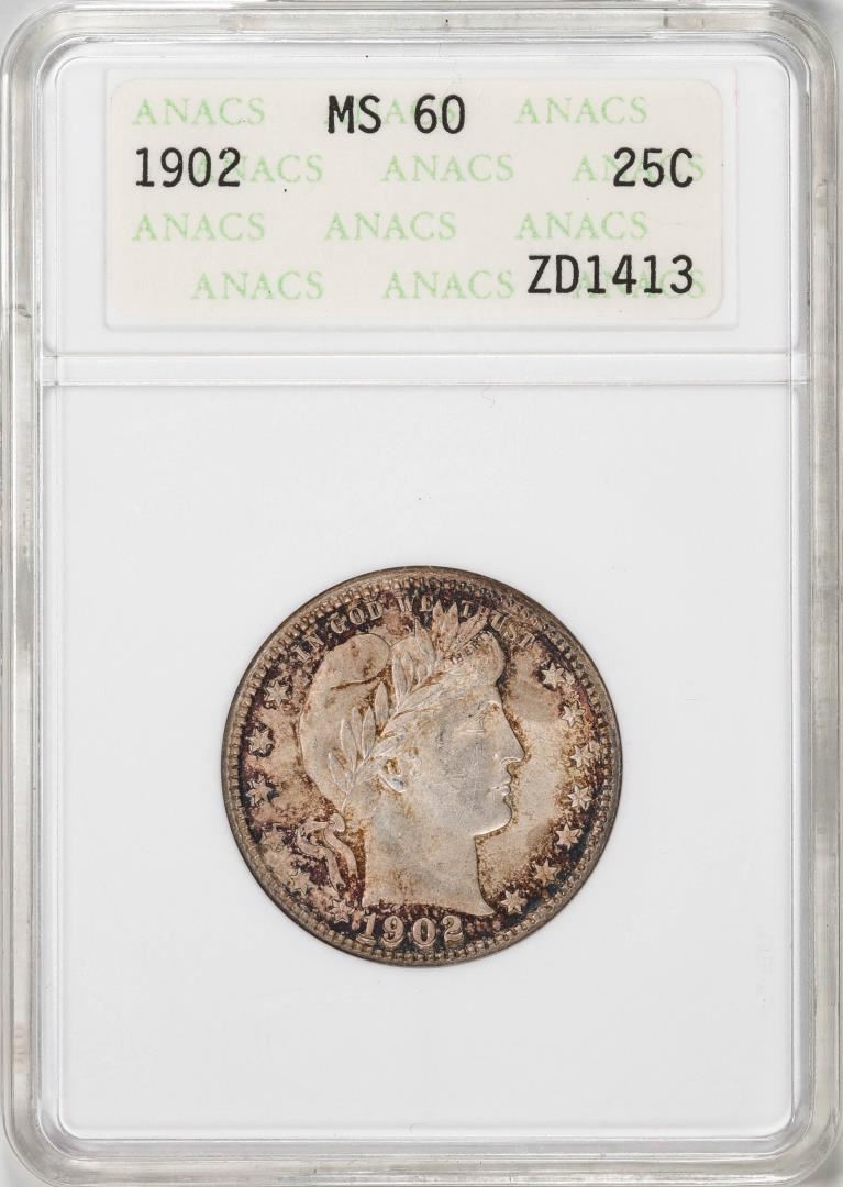 One 1902 Barber Quarter Coin ANACS MS60 Old Soapbox Holder. ANACS Certified.