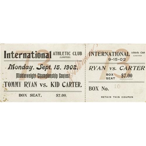 <B>1902 Carter vs. Ryan Full Ticket.</B></I> On September 15, 1902, World Middleweight Champion Tommy Ryan successfully defended his title by stopping challenger Kid Carter in six rounds at the International Athletic Club in Fort Erie, Ontario. For Ryan this would mark his fourth successful defense of the title that he had captured in 1898. Presented here is a full official ticket to this event. The ticket measures 2.5x6.5" and names both fighters. The stub is firmly attached and includes a section, row and seat number. There are a few pinholes on the left edge, the corners are rounded and there is slight soiling. A very scarce Championship ticket. <I>LOA from Craig Hamilton / JO Sports.</B></I>